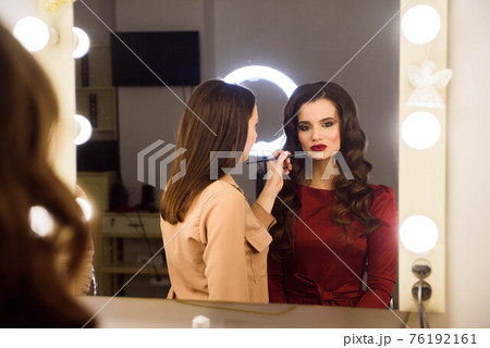 Make up artist doing professional make up of young woman. School of make-up artists.