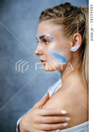 Creative fashion beauty portrait of a beautiful young blonde woman with an artistic tassel in her hands.