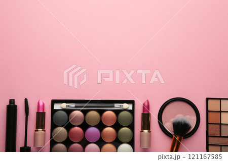 Set of decorative cosmetics on pink background with copy space. Make up cosmetics