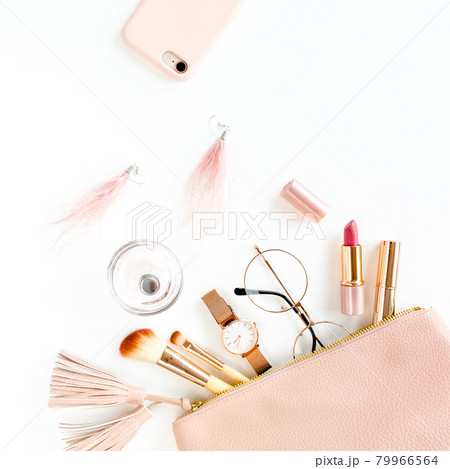 Flat lay composition with pink cosmetic bag with cosmetic makeup products, isolated on white background. Flat lay, top view.