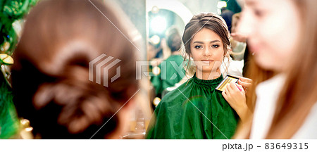 Makeup artist work in her beauty studio. Woman applying by professional make up master. Beautiful