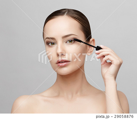 Beauty woman applying makeup. Beautiful girl looking in the mirror and applying cosmetic with a