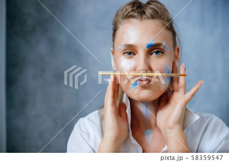 Hand of makeup artist hold lipstick brush and doing makeup. Beautiful model smile. Background of