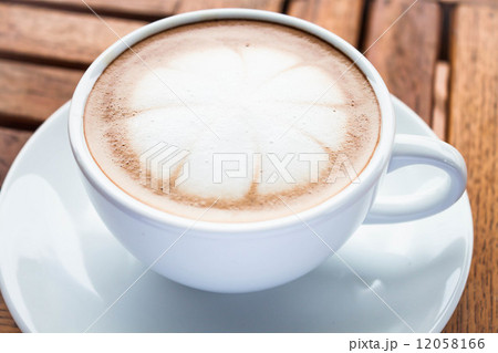 Hot coffee latte with latte art milk foam in cup mug on wood desk on top view. As breakfast In a coffee shop at the cafe,during business work concept