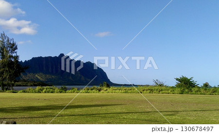 ハワイ 海沿いに広がる草原と奥にそびえ立つ有名なクアロア山 コピースペース有り 大自然テーマ広告素材
