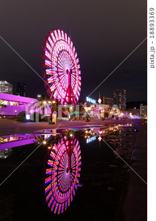 神戸モザイクガーデン大観覧車と波止場の水溜りに映える景観