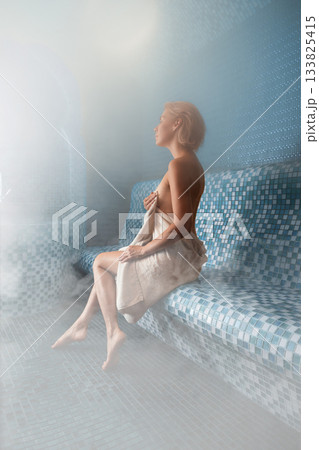 Serene woman in white towel sitting in profile on blue mosaic bench surrounded by thick steam and mist in tranquil hammam spa, soft diffused lighting creating wellness atmosphere and relaxation
