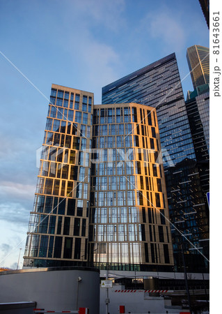 朝日を浴びるガラス張りの近代的な高層ビル モスクワの街並み