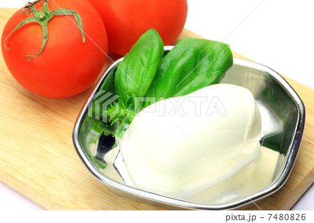 白いマナイタに置かれたモッツァレラチーズ 赤いトマト バジリコ