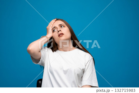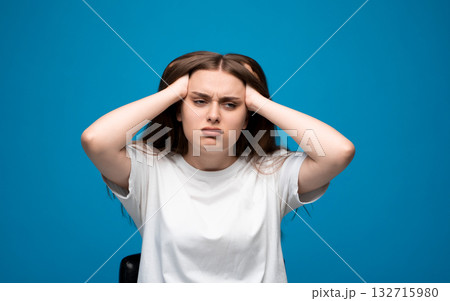 Angry young woman with long brown hair holding head in frustration on blue background