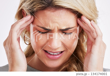 Woman, headache and stress or pain while frustrated with anxiety, depression and burnout or mental health. Face of a female feeling fatigue, sick or brain fog problem isolated on a white background