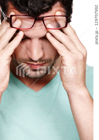 Mental health, depression and face of studio man with anxiety problem, burnout fatigue and depressed over mistake. Medical healthcare crisis, headache and sad model with migraine on white background
