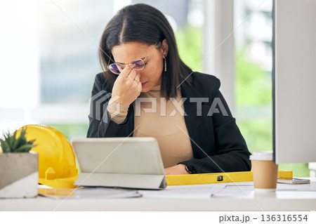 Mental health, architect burnout and woman stress over development project, floor plan analysis or design. Sad, headache problem and business person depressed about architecture engineering mistake