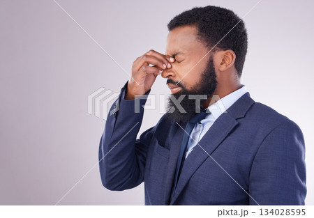 Business, headache and black man in white background of anxiety, debt and frustrated on studio mockup. Corporate male, face and stress of pain, burnout and bankruptcy in problem of financial failure