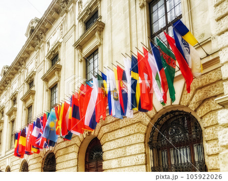 flags of different countries, flags of different countries on the building, historic building, international cooperation, OSCE