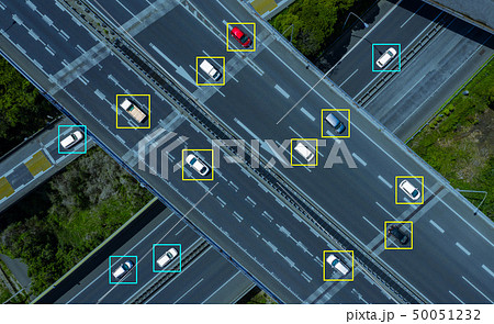 高速道路を走る自動車と情報技術イメージ ITS ICT