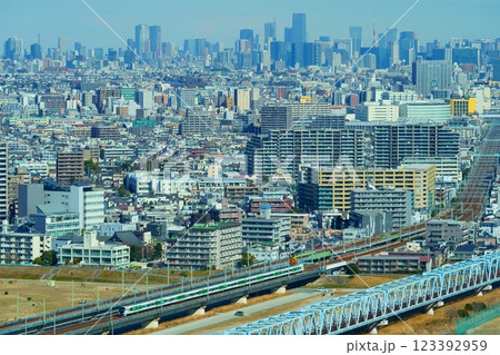高層ビル群を背に走る特急踊り子、都市の鉄道風景