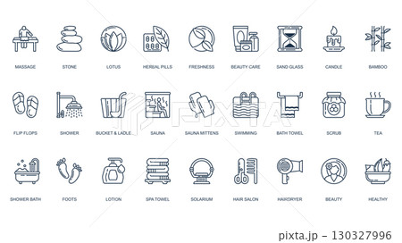 Beauty icons set in outline stroke design for web. Pack line pictograms with massage, stone, lotus, herbal pills, spa salon, candle, bamboo, flip flops, shower, lotion, more. Vector illustration.