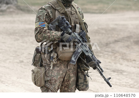 Soldier with machine gun and flag of Democratic Republic of the Congo on military uniform. Collage.