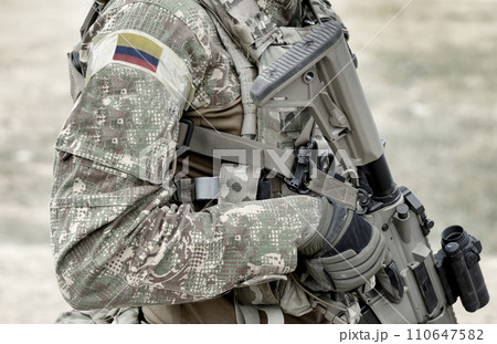 Soldier with assault rifle and flag of Colombia on military uniform. Collage.