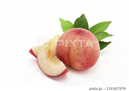 葉を添えた白バックの桃_夏が旬の果物