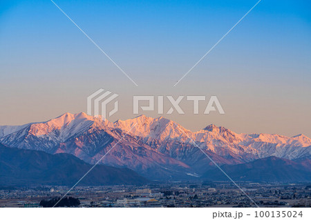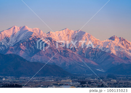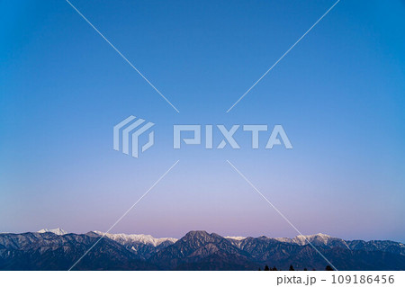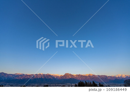 【朝焼け素材】朝焼けした北アルプスと青空【長野県】