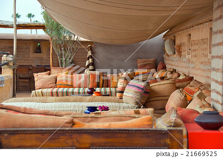 きれいなタイル張りの床と壁のレストランに置かれた丸いデザインのイス モロッコの街マラケッシュにて