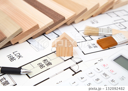 住宅と建築図面と建材