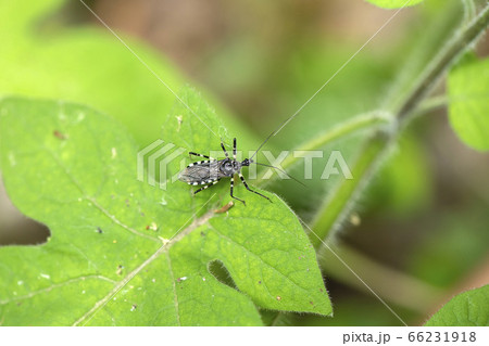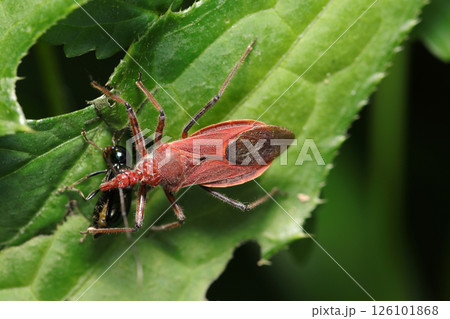 野アザミの葉上で獲物の体液をすする森のハンター、アカササシガメ(自然環境下ストロボマクロ撮影)