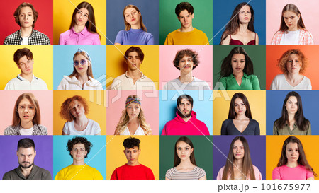 Collage of diverse, emotive, young people, men and women expressing shocked, surprised emotions over multicolored background. Vide range emotions