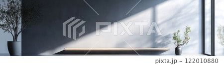 Modern hall interior, empty gray wall, clean and simple design, diffused daylight. Banner with copy space.