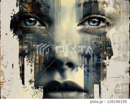 都会の孤独を映す人物の瞳。抽象的な幻想アート