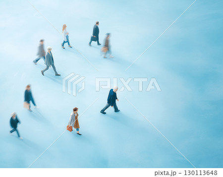 ブルーの背景で歩く群衆を俯瞰で捉えたコンセプチュアル写真