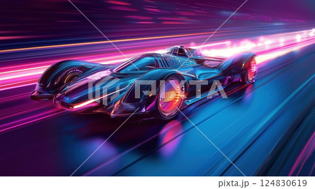 ネオンに包まれたレース中の近未来カー
