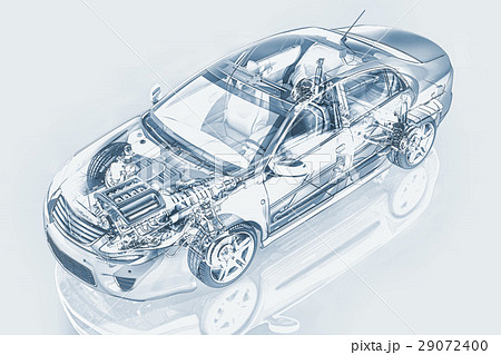 Generic sedan car detailed cutaway representation, with ghost effect, in pencil drawing style, on neutral backgound.