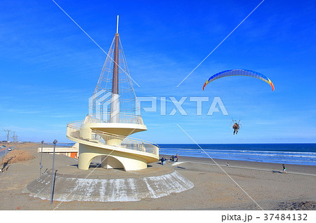 【千葉県】晴天下の九十九里ビーチタワーとモーターパラグライダー