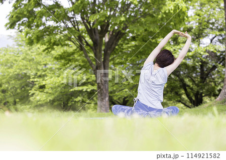 外でストレッチをする若い女性後ろ姿 外ヨガイメージ