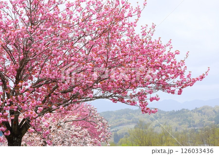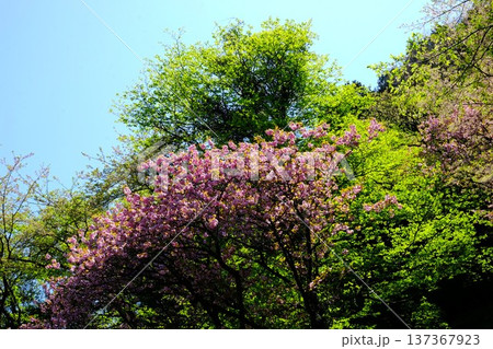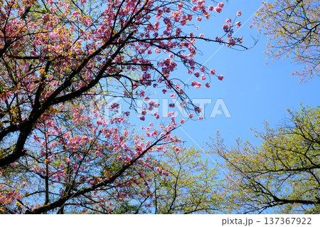青空に咲く八重桜と新緑の木 【相模原市津久井 4月】