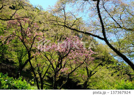 八重桜と新緑の木々 【相模原市津久井 4月】