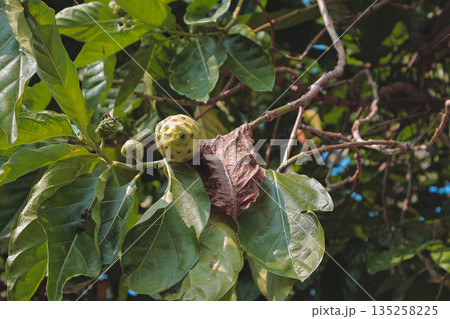 Noni fruit growing on tree branch with lush green leaves in natural sunlight, showcasing tropical plant for healthy lifestyle concept.