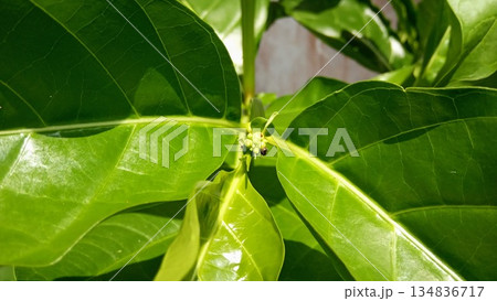 Green Indian Mulberry Fruit Developing on Stem with Ants Symbiosis