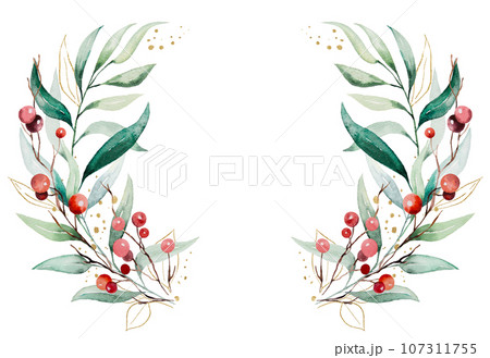 Christmas wreath with watercolor twigs with green leaves and red berries. Holidays Illustration
