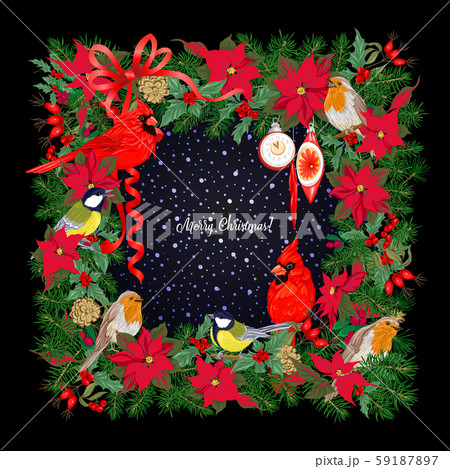 Christmas card with Wreath Made of Pine Branches, Berries, Christmas Flowers and other Festive Elements