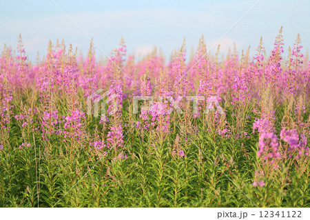Blooming fireweed vibrant pink flowers reaching for the sun in a lush green habitat during late spring season