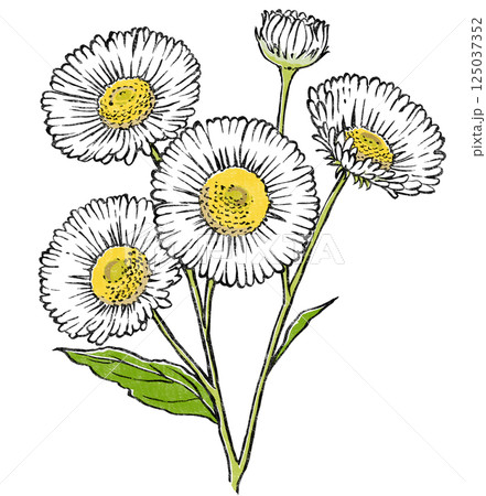 4輪の花と蕾を1つ付けたヒメジョオンのクローズアップ 筆描き・2色塗り
