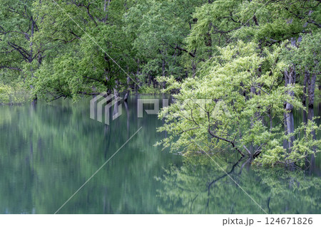 朝霧に包まれる新緑の「白川湖の水没林」(山形県飯豊町)