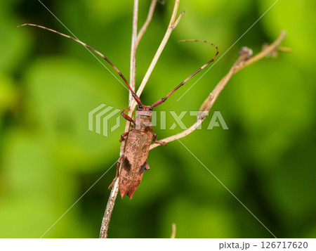 生き物 昆虫 ヤハズカミキリ、雑木林の遊歩道。長い触角が遠くからでも目立ちます