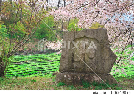 春の信州安曇野 大王わさび農場に咲く桜と道祖神