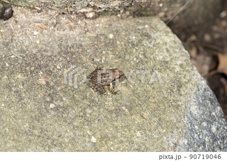 生き物 両生類 ヤマアカガエル、二センチほどの幼体。お腹いっぱい餌を食べて休憩中?