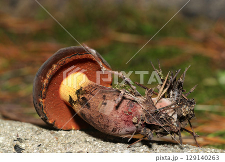スポンジケーキのようなコガネヤマドリキノコ側面全体象(自然下菌キノコ類マクロ撮影)